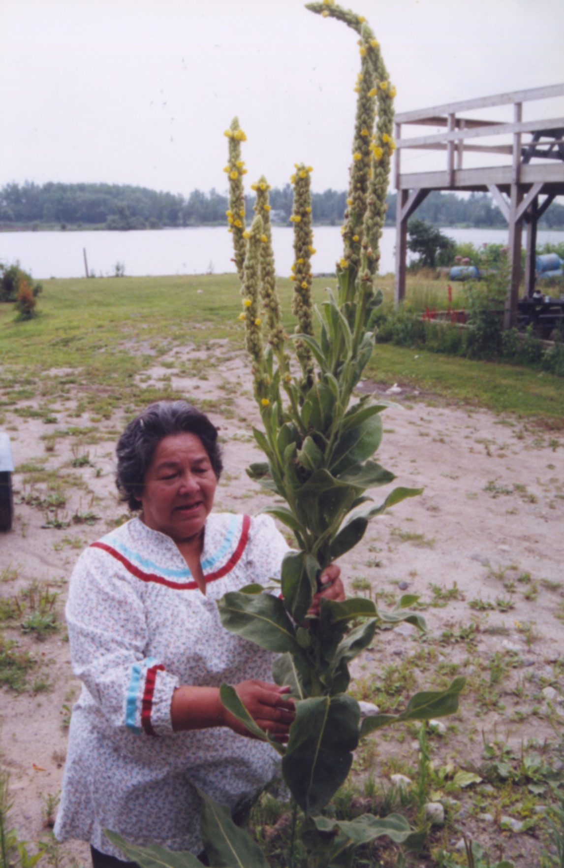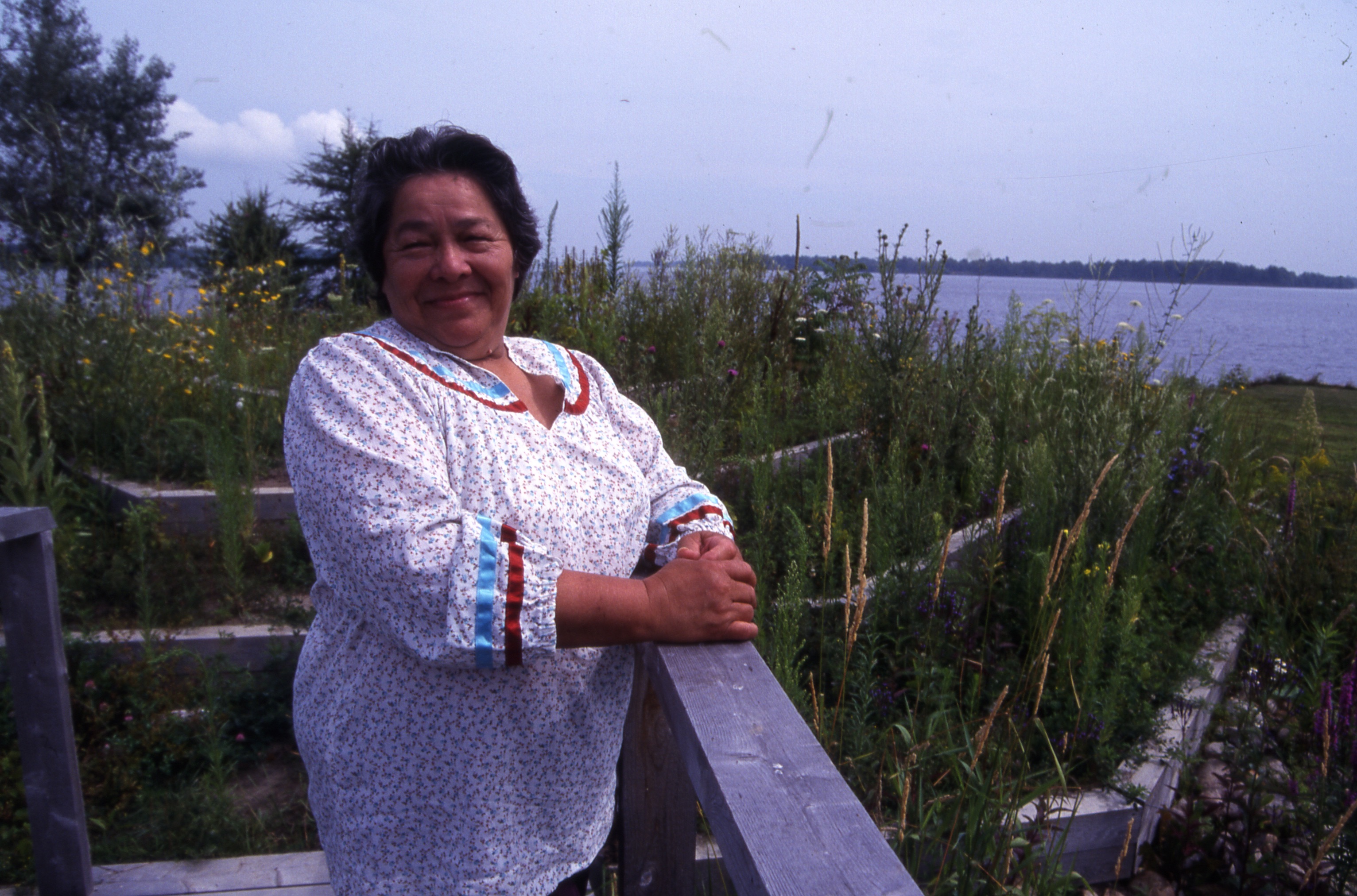 Cecilia (Kaienes) Mitchell is a short, amiable woman who is constantly in motion—making sweetgrass baskets, sewing ribbon dresses, cooking traditional corn soup, beading ritual garments—she does it all. For many, it’s her knowledge of growing things that makes her special, for Cecilia is a medicine woman, an herbalist who knows the fields and woods around her as resources for healing and comfort as her ancestors practiced for many generations. Her own backyard in the village of St. Regis is a microcosm of medicinal and culinary plants of our region. She is most proud of her ‟medicine wheel,” a large, five-tiered, raised garden, surrounded by a small trout stream. From early spring till late fall, Cecilia is in the garden daily, harvesting seeds, flowers, and roots for her own use or to give to the many visitors who stop by for guidance, good talk, and perhaps a jar of special tea of a handful of bitter twigs, each with her personal instructions for use.