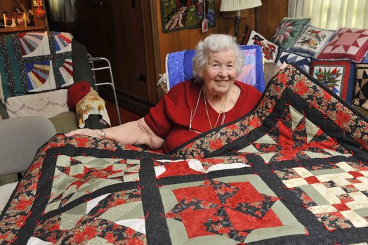 Nearly a century ago, Mildred Munson Newvine taught her young daughter Elaine to quilt at the quilting frame in the parlor of their old farmhouse. Tied quilts, also commonly called comforters, were their specialty. While both tying and quilting can be used to fasten the quilt’s three layers, tying was historically favored in the North Country, as it was faster than quilting and permitted thicker batting (interlining), the better to keep warm in winter’s cold. In the summer, neighbors would gather under the shade of a tree at Elaine’s home to tie off a quilt on the frame, inherited from her grandmother. At age 91, Elaine is now a prolific quilter with a masterful eye for color. She has given more than one hundred quilts to her large extended family and friends, as well as to those in need. She is the informal matriarch of a group of Parishville quilters who gather weekly to socialize while piecing tops and tying quilts in the traditional way.