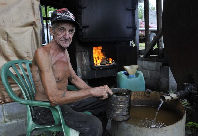 One of the oldest woods-related industries in the region, cedar oil production has all but disappeared in recent decades. Made by cutting new growth white cedar twigs, piling them into vats attached to steam boilers, and distilling the aromatic essential oil, cedar oil was once an important seasonal source of cash for many small farmers and woodsmen. Floyd Snyder’s grandfather and father taught him how to make the oil when he was a teenager, and it has been a major occupation of his ever since. Now in his 60s and with his son’s help, he continues to cull young trees from his woodlots, trim the greenery for oil, and make cedar posts. With vintage equipment including two huge wood-fired boilers, they make several hundred pounds of oil each year. Due to foreign competition and new synthetic products, the market has diminished significantly in recent years, but Floyd is dedicated to keeping the process going as long as he can.