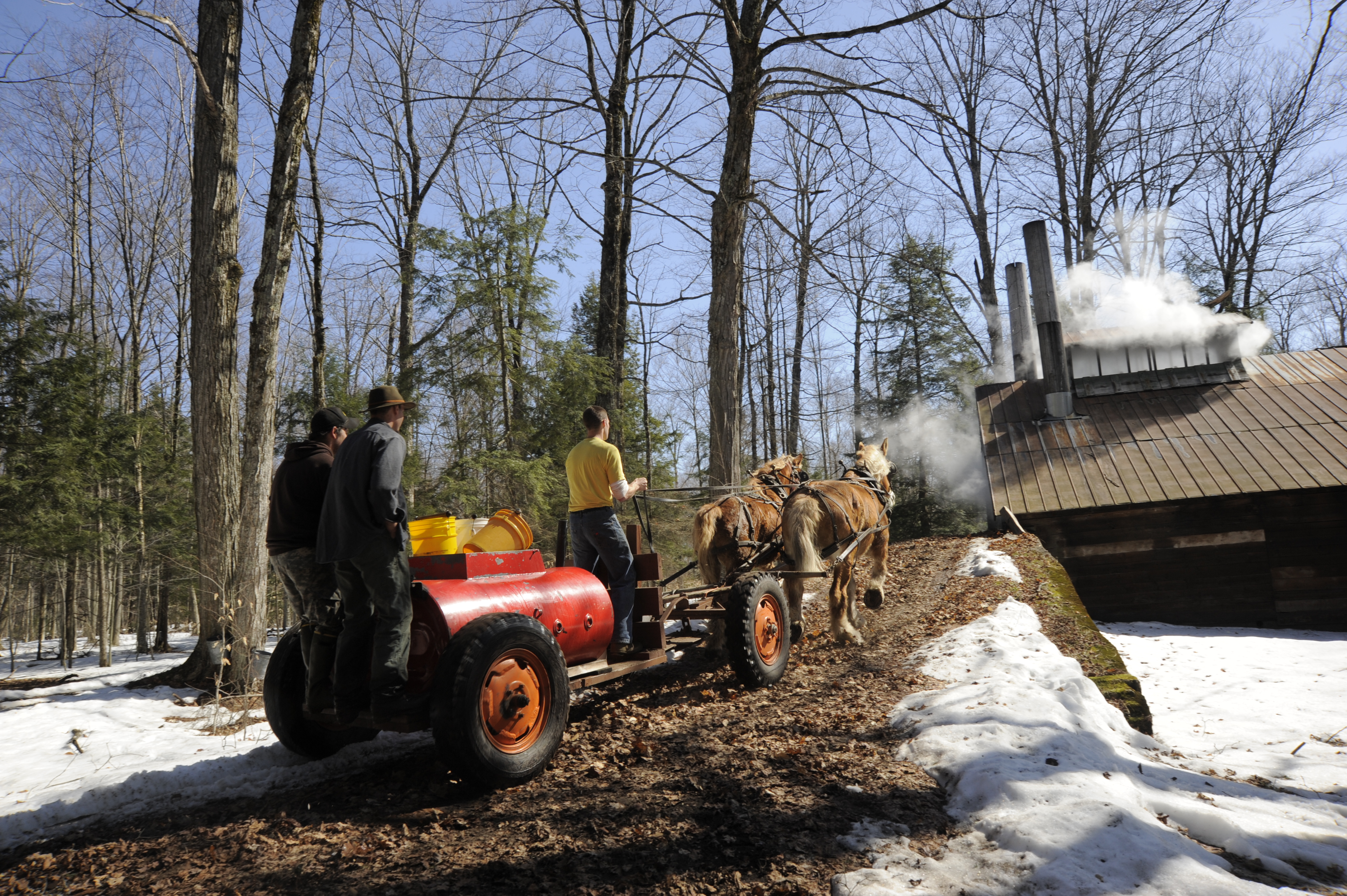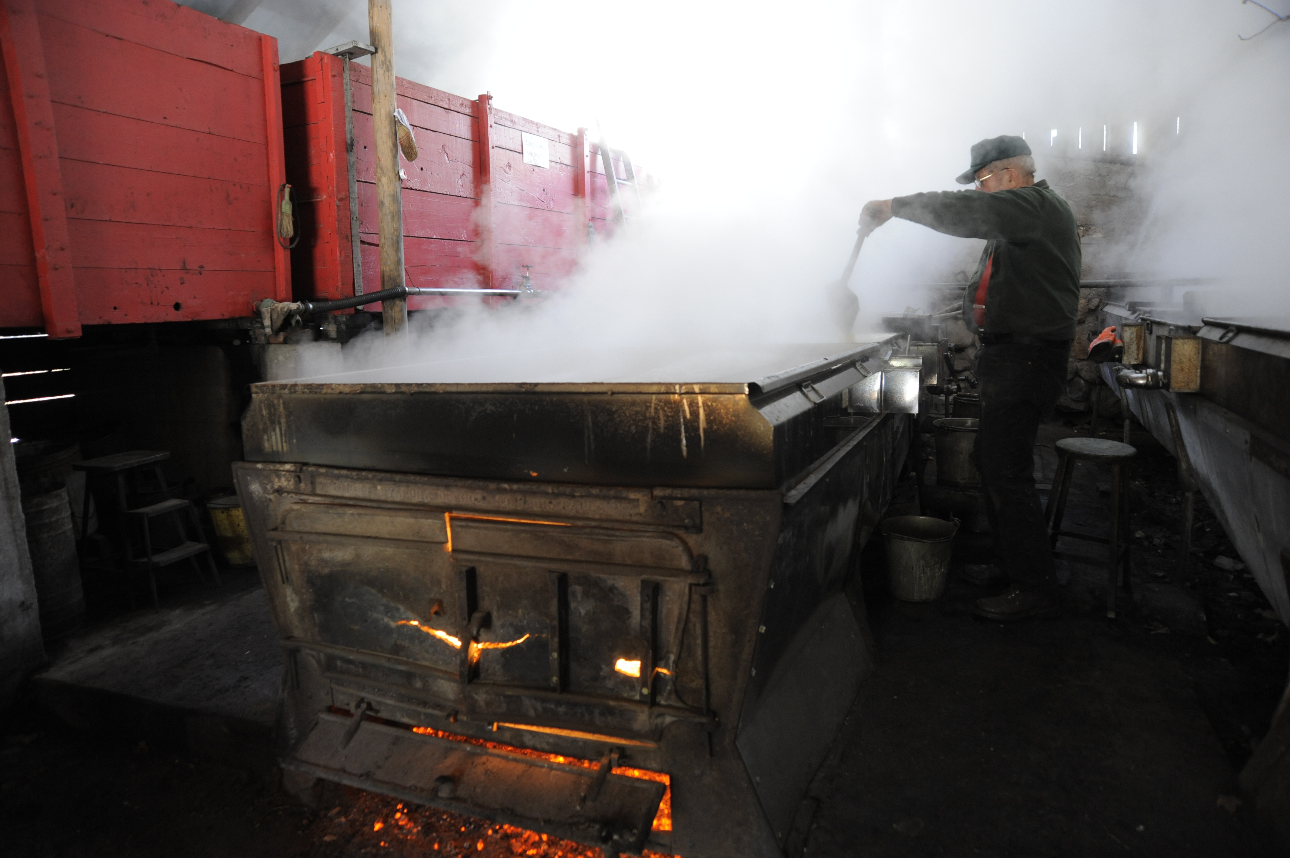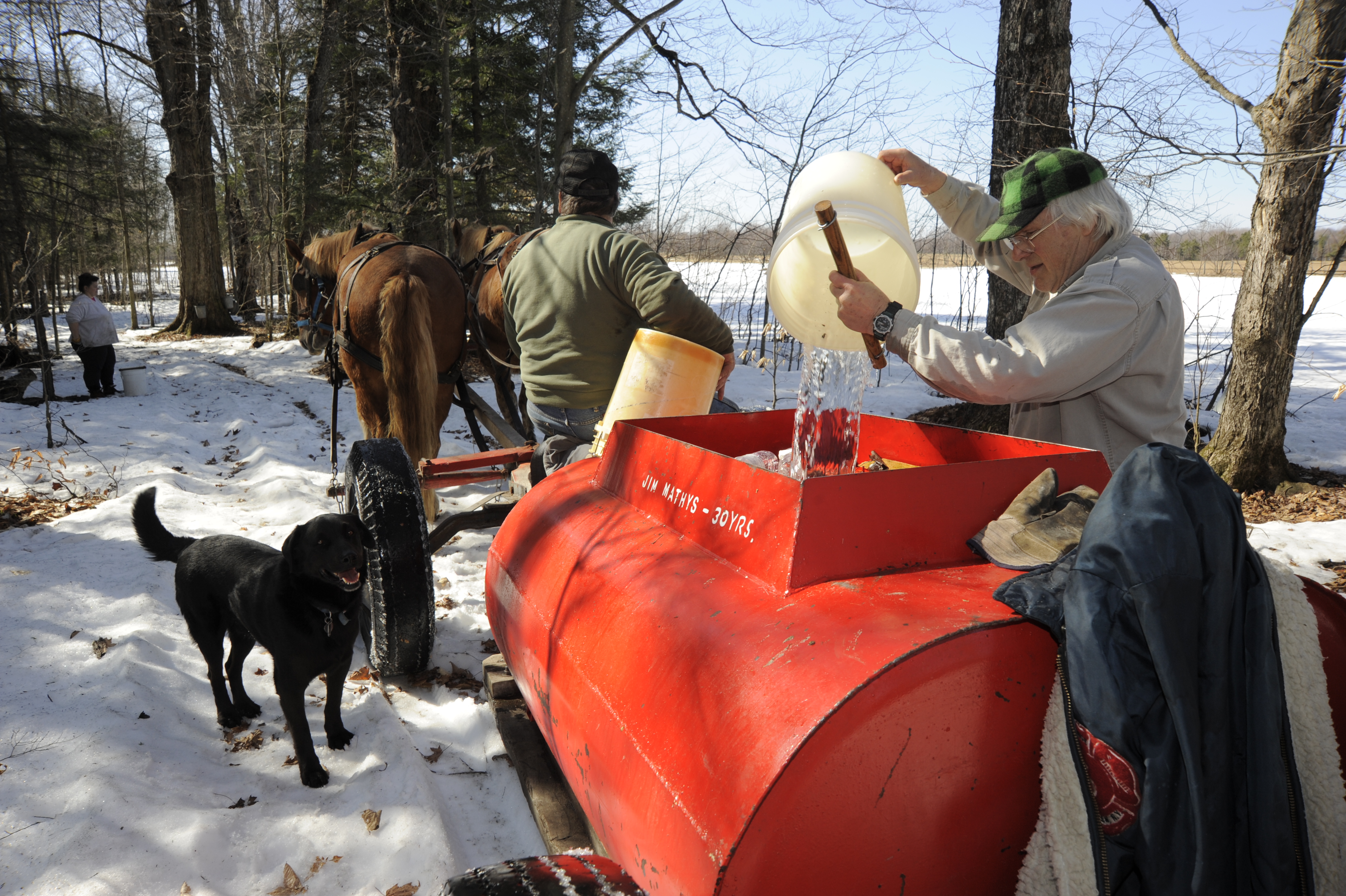 Maple sugaring is a passion for Haskell and Jane Yancey, whose ancestors first tapped trees on the Yancey farmstead in 1844. They and their children and son-in-law—Beth along with her husband Dan Faulknham, Tim, and Cathy—represent the fourth and fifth generations to make maple syrup on the Yancey farm, gathering sap each year from their over 5,000 maple trees. Beth and Dan’s daughters Jocelyn and Margot are the sixth generation working in the sugarbush. Over the years, the Yanceys have resisted pressures to convert entirely to the use of plastic tubing and vacuum pumps for gathering sap, and remain one of the few sugarbush operators who continue to gather with buckets and horse-drawn tanks. The number of trees they tap, and the methods for tapping them, vary by year—at times, they have tapped 6500 trees over 170-180 acres. At the time of a visit in 2021, they had 2700 taps on a vacuum system, 600 on tubing working with natural flow, and roughly another 1200 buckets out on trees. Some of the equipment they use dates to the first half of the 20th century, and their 1920s-era evaporator is fueled by wood cut on their woodlot. Each maple season the sugarbush becomes a social mecca for family, friends, hired hands, and visitors new and old who come to watch the sugaring—and take home syrup and maple candy—year after year.